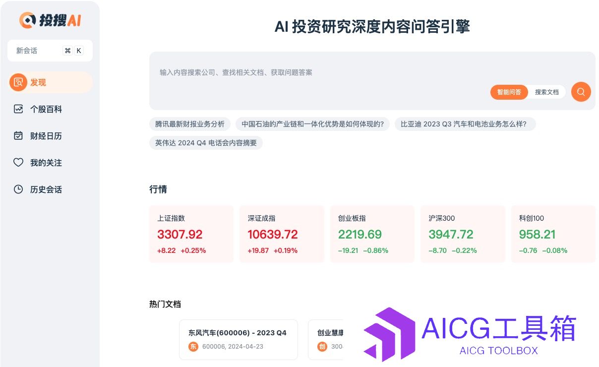 投搜AI是一款专注于投资研究的智能分析平台,利用先进的人工智能技术,为您提供个性化的投资分析和实时的市场洞察。