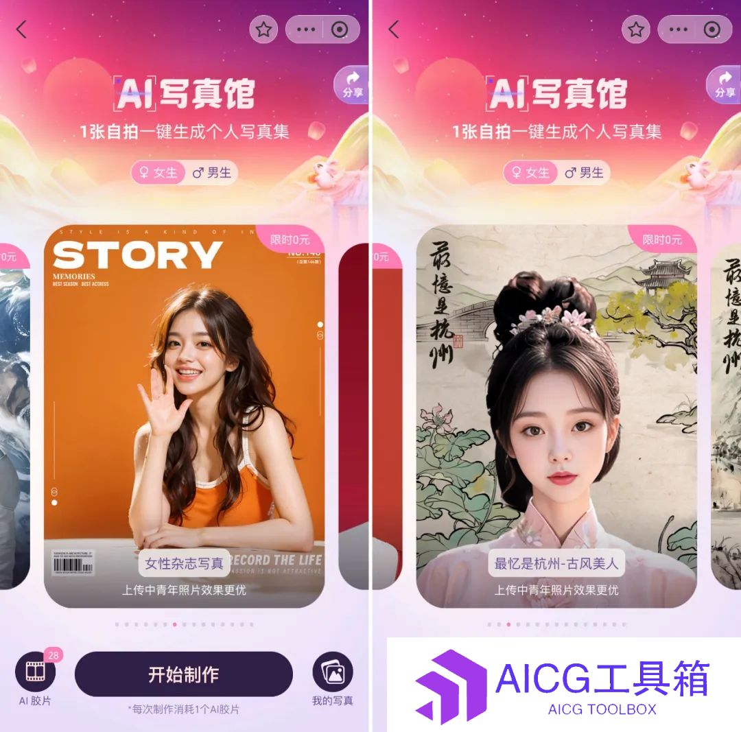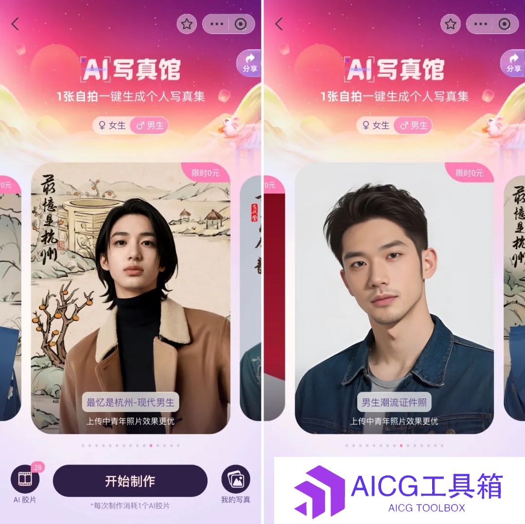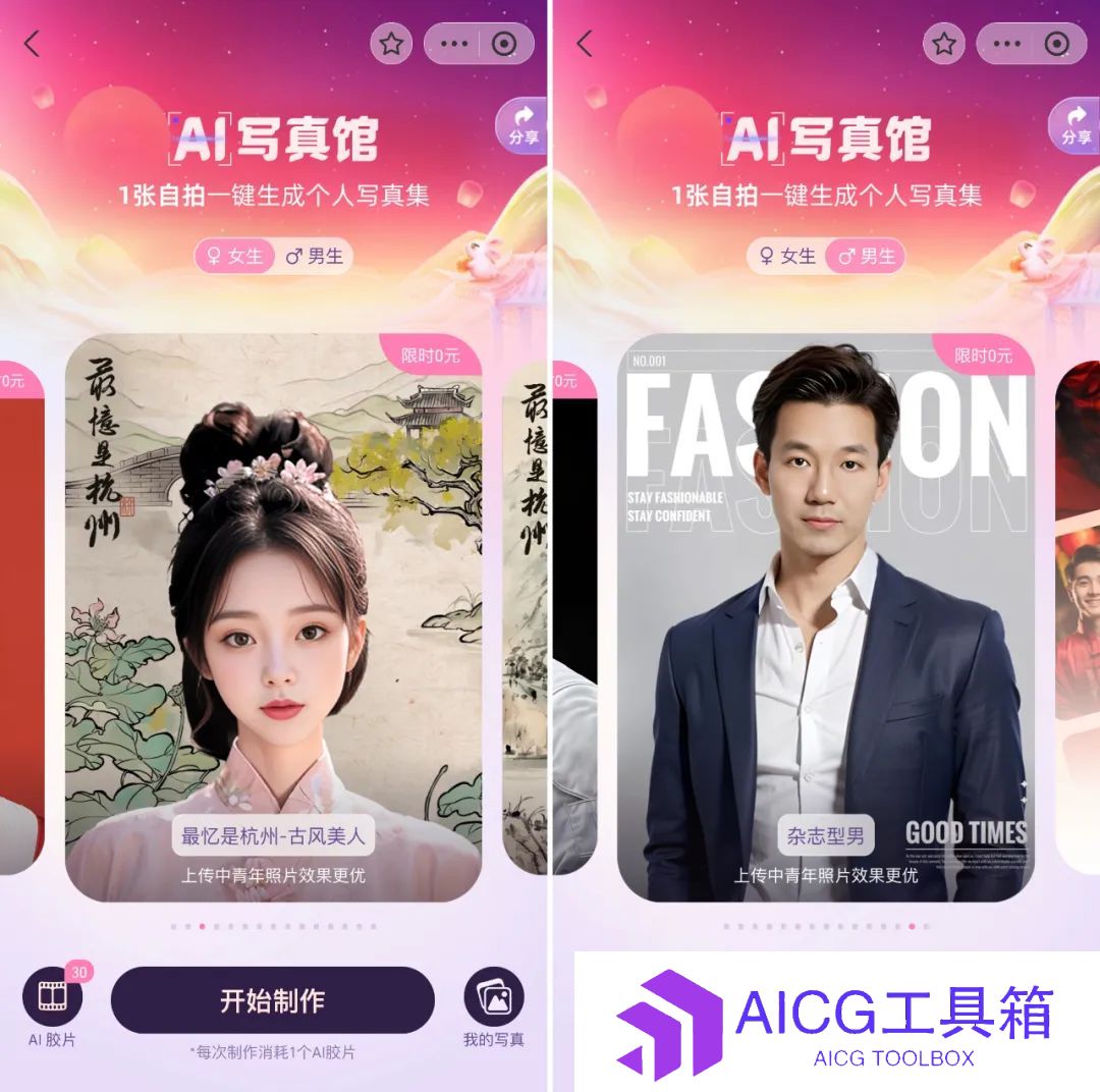 ??男生限时免费生成时尚**照、古装照、杂志封面照等等7种风格**照。