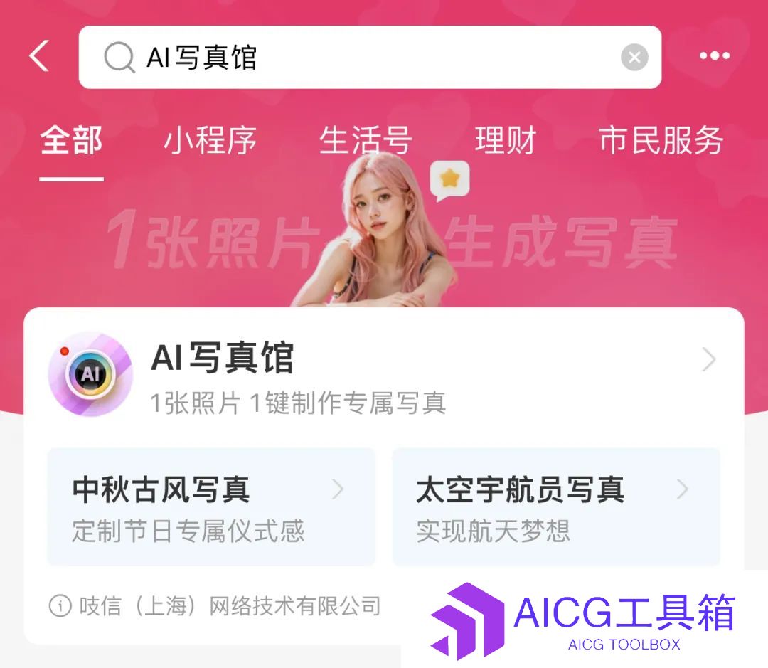 支付宝APP内搜索?:AI**馆,即可进入该小程序应用。可以看到这款小程序的开发商是上海吱信,属于蚂蚁集团旗下子公司。